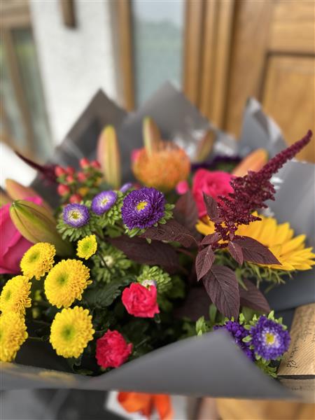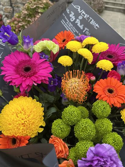 Expertly hand-tied for a natural yet abundant finish, The Gainer Bouquet blends vivid hues in a balanced, free-flowing composition. Strong pops of colour are softened with complementary tones to create depth and movement, resulting in a bouquet that feels lively yet carefully curated. The overall effect is full-bodied, expressive and unapologetically cheerful.