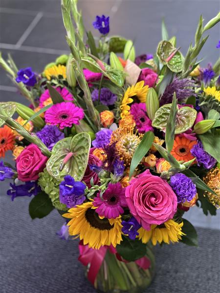 The Gwinear Bouquet is a bold, high-impact hand-tied arrangement designed to energise any space. Bursting with bright, saturated colour tones, this bouquet is all about vibrancy, confidence and joyful expression. It’s a dynamic floral design that immediately draws the eye and lifts the mood.