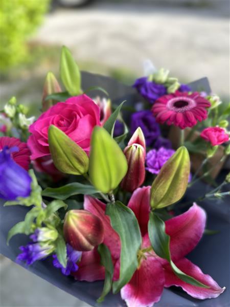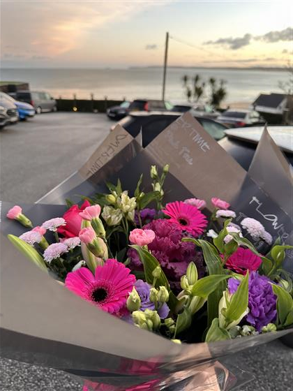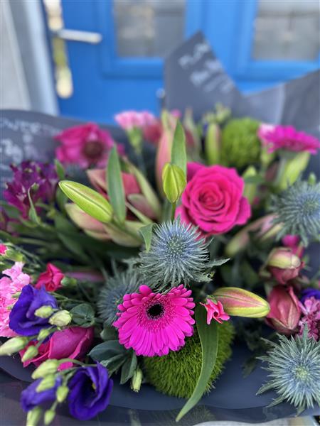 The Hayle Bouquet is a beautifully balanced pink and purple hand-tied arrangement that captures warmth, romance and vibrant charm. Inspired by glowing sunsets and rich coastal tones, this bouquet blends soft pink hues with deeper purples to create a striking yet elegant composition.