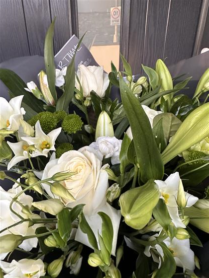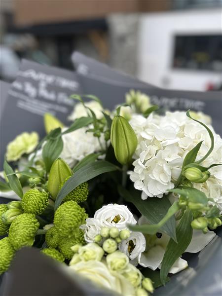 Hand-tied to achieve a soft, natural flow, the arrangement focuses on balance, texture and freshness. The combination of pure white shades and layered greenery creates depth while maintaining a light, airy feel. The overall design is graceful and understated, making it a versatile bouquet suited to both modern and traditional settings.