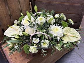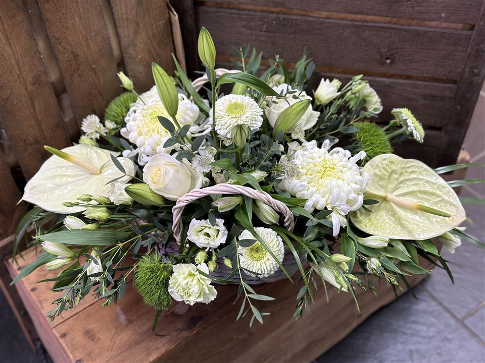Perfect for graveside tributes or as a display at a funeral service, this basket combines colour, texture, and fragrance to create a warm and comforting tribute. Available in a variety of colour palettes, from serene whites and pastels to vibrant tones, it can be personalised to reflect your loved one’s personality.